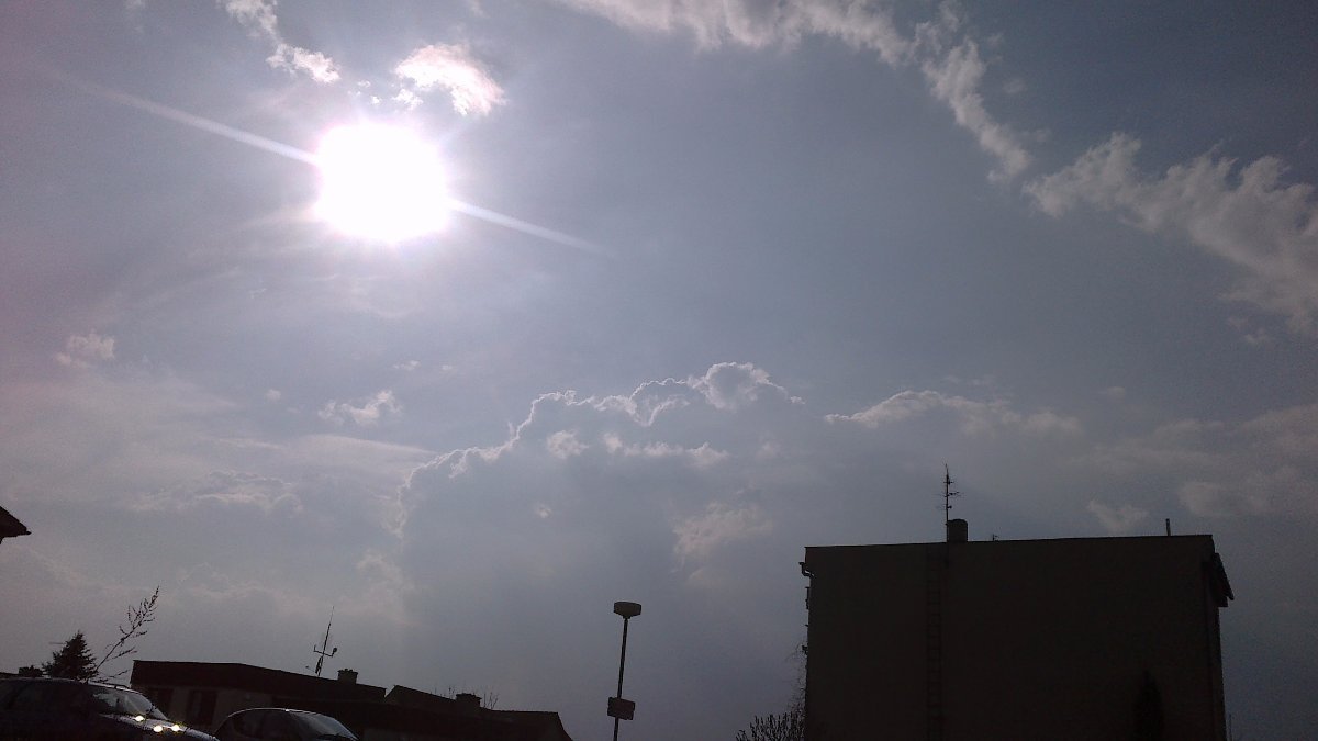 Ještě před hodinou bylo zataženo, začalo poprchávat, ale teď nad námi již obloha úplně modrá. Pouze od Českého lesa se nasouvá další oblačnost - viz foto. Je dusno jako v prádelně...