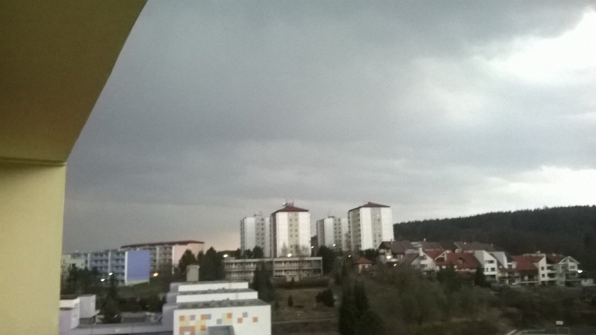 skoro zataženo, po slabé bouřce, dnešní západ slunce