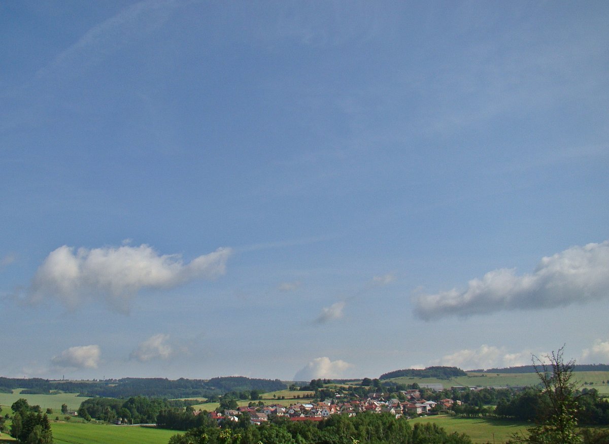 ...bezvětří,... ani lísteček, teploměr na slunci blunci se vyšplhal přes třicet, a přes celou oblohu zůstávají kondenzáty po érách pomalu se měnící v obláčky...