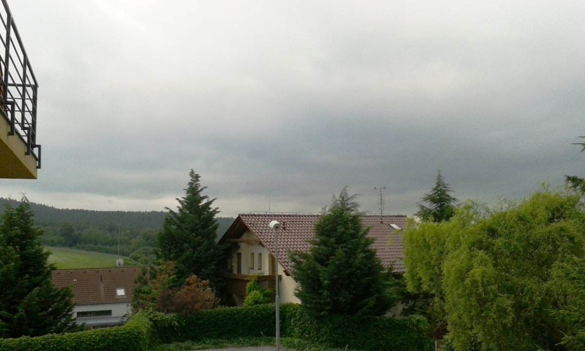 foto z 2015 06 15 v 08:12 zachycuje zataženou oblohu a po včerejším dešti a kroupách trochu rozvalenou růží a květy černého kořenu, jinak je venku příjemně - trochu více vlhko