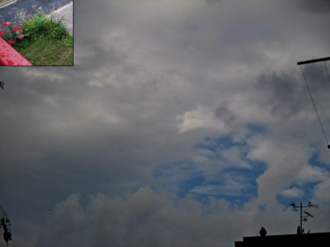 ...do dálavy (nad Tachovsko) mizející souvislý dvě hodiny přecházející pás dešťové slohy, včera po 17té a dnes okolo druhé hodiny přívalové deště s bouřkou....nárazový vítr, vyjasňuje se...