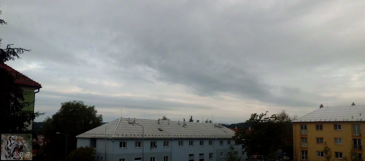 Oblačnost více pater, severozápadní větřík, tlak 1012 hPa a vlhkost 97 %.