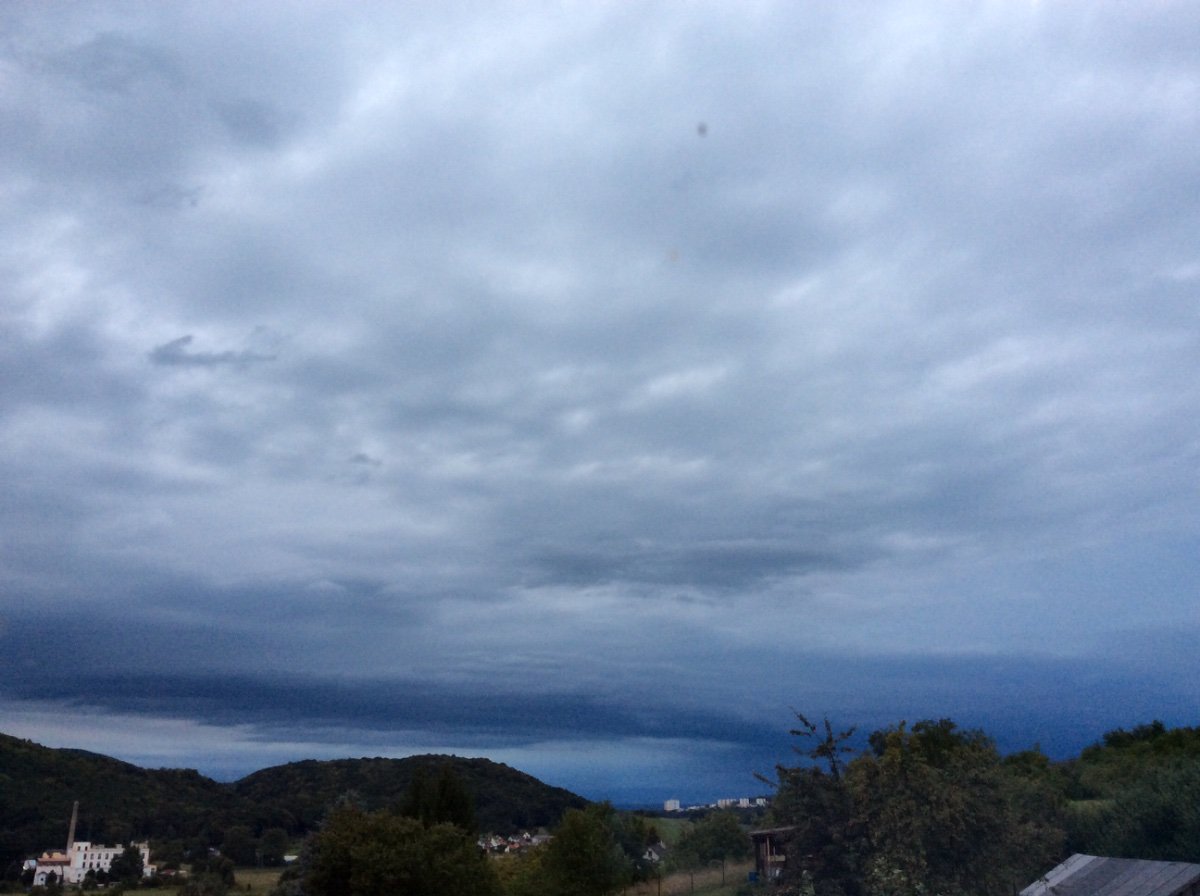 Silný západní vítr. Vše co není přivázáno, tak lítá. Silně se zatemnilo, jako kdyby mělo pršet.
