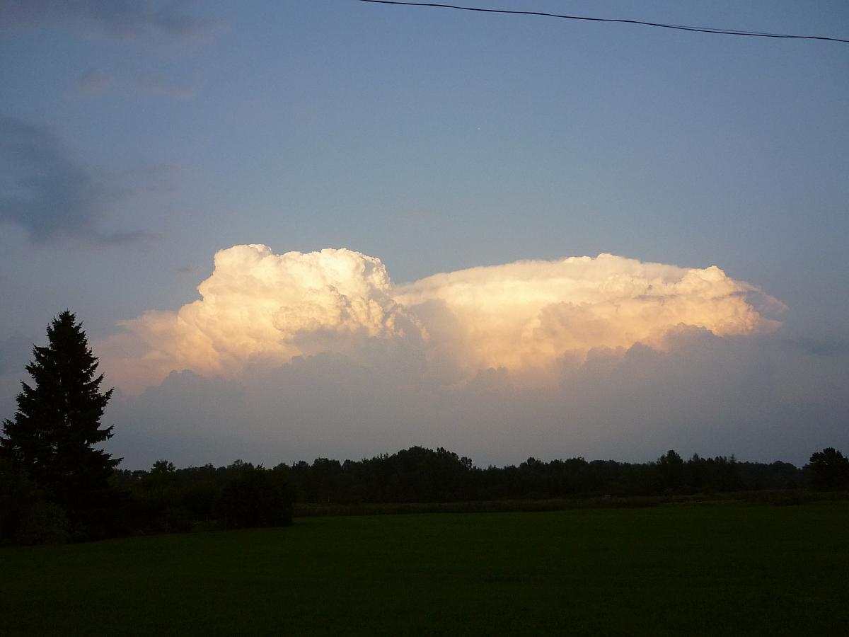 Vítá nás krásná a zajímavá obloha,kdo by něco takového dokázal namalovat.Současný stav : tlak vzduchu 1014HPa,vlhkost 70%,teplota 23°C,mírný větřík.Skoro na celém území včera pršelo,byly bouřky a dokonce krupobití. U nás opět ani kapička.Čauky kamarádi