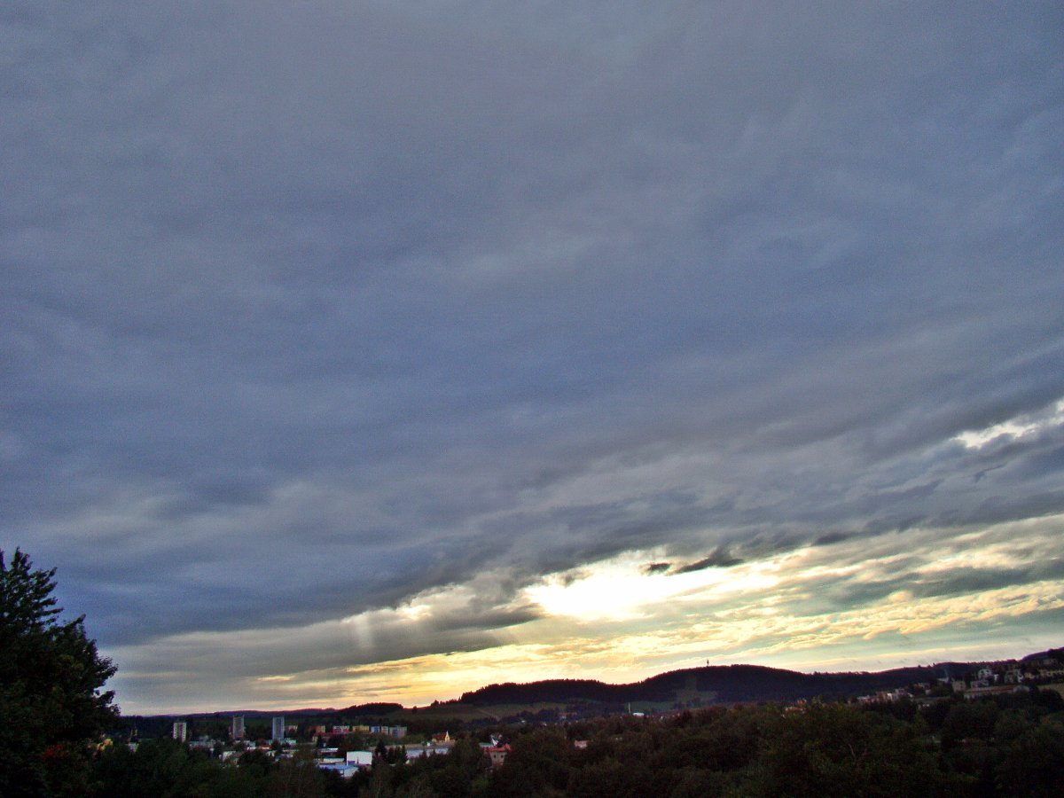 Zataženo, ale už neprší. Nalevo v dáli s vysílačem je Kleť, nejvyšší hora Blanského lesa.