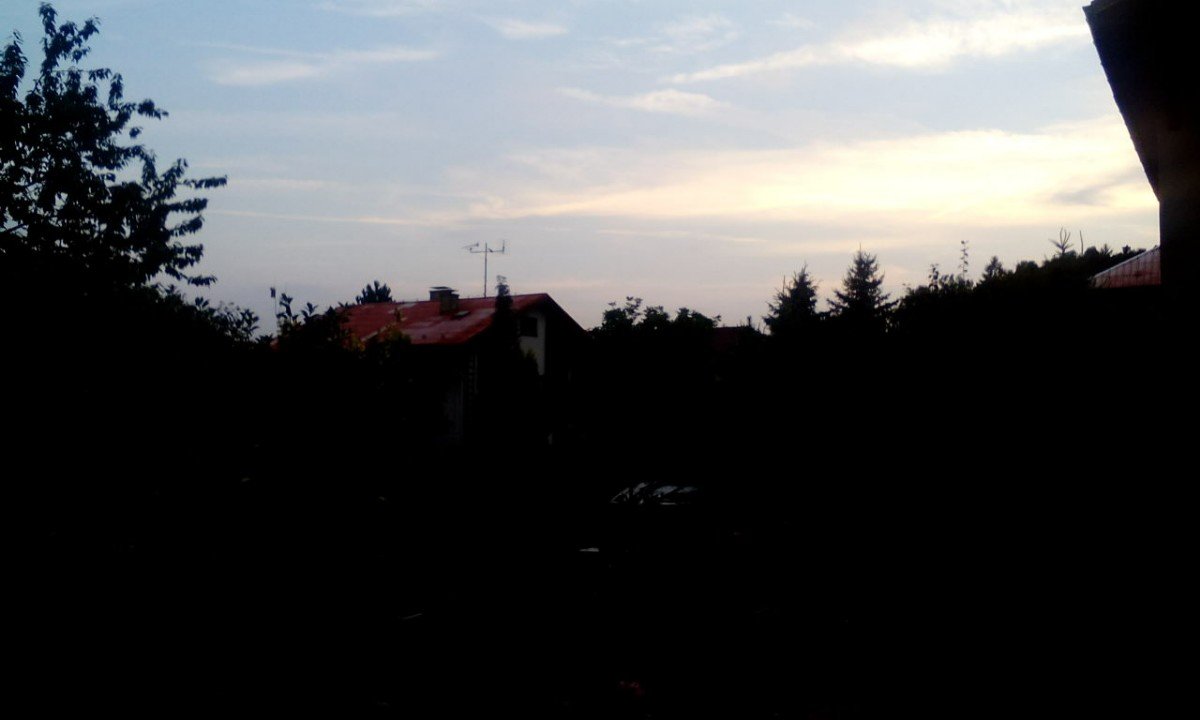 Od včerejšího večera napršelo 9 mm srážek. Okolo poledne přestalo pršet, odpoledne začalo skrz mraky vysvitat sluníčko. Nyní se opět zatáhlo - viz foto.