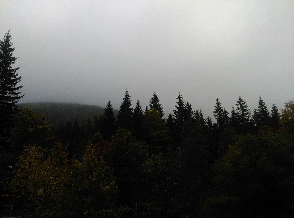 zataženo, mlha + slabé mrholení