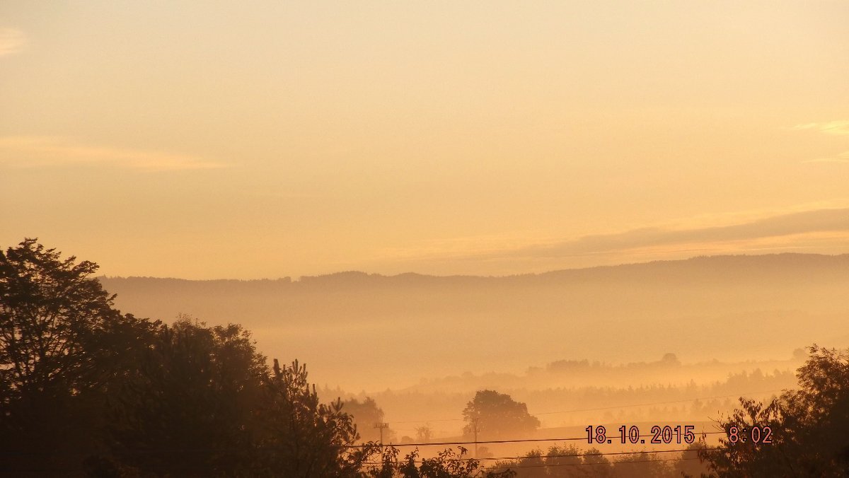 Oblačnost 100%, zákl.oblačnosti 394,36m.n.m., tlak 1020,2hPa, dohlednost 200m, rel.vlhkost 99,7%, abs.vlhkost 6,17g/m3, JJV vánek 155° 0,9m/s(1 Bft), poc.teplota 1,68°C, ochl.větrem 3,37°C, tepl.ros.bodu 3,55°C, tepl.mraků -0,28°C, délka dne u nás = 10hod.38min.20vt.