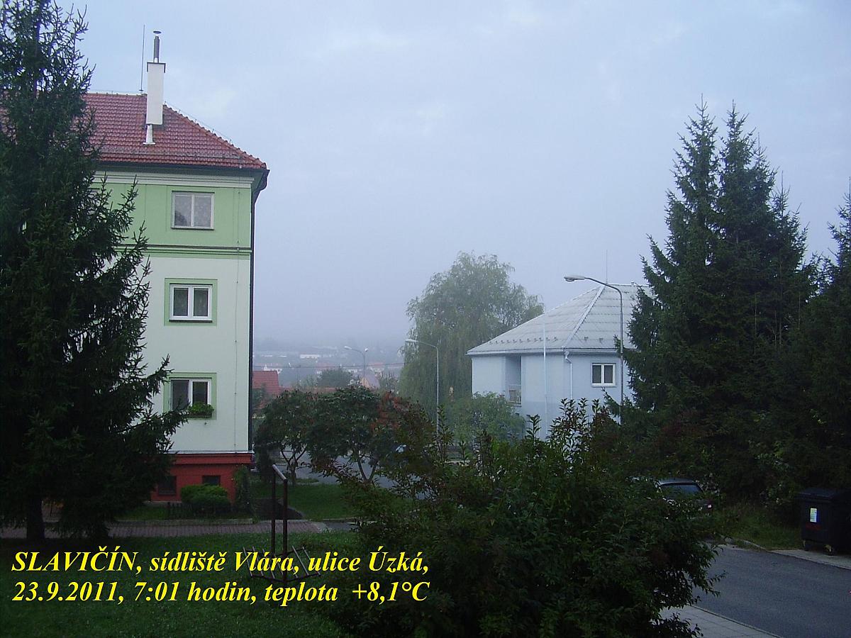 Oblačno v 7:00 hod., teplota 21,5°C, tlak 1020 hPa, bezvětří, vlhkost 94%...