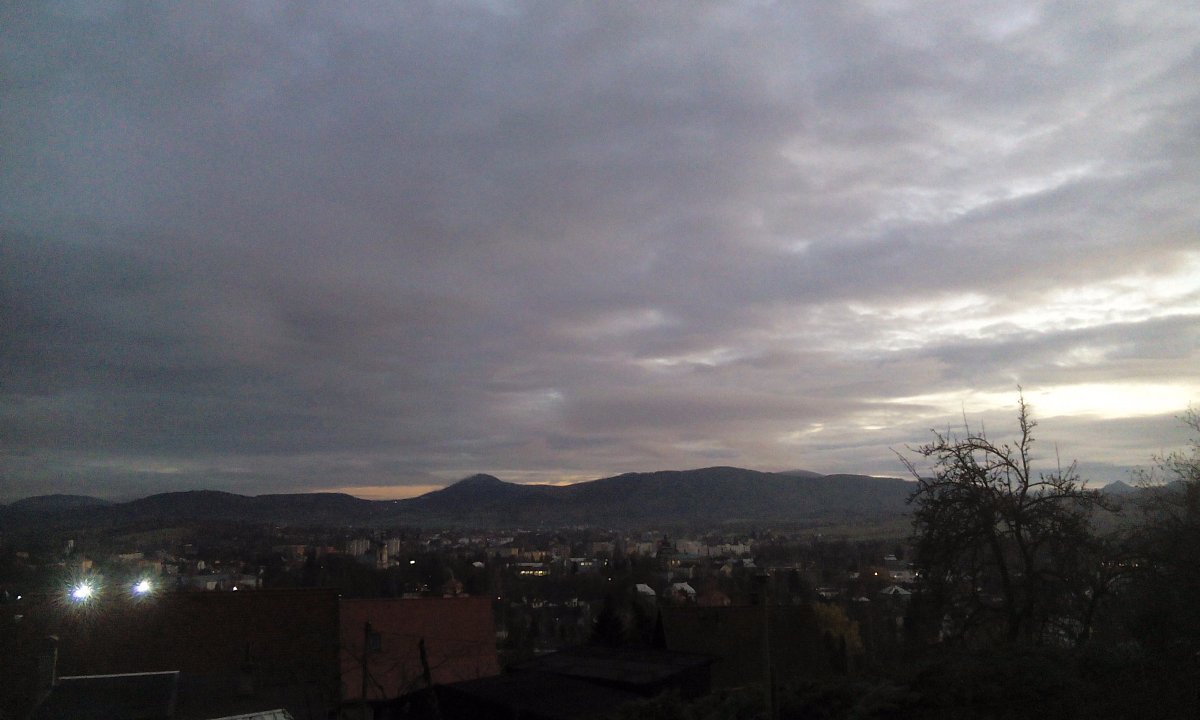 Tlak 1025 hPa, vlhkost 76% vítr jižní 4.8 km/h. Je jasno, jen v dáli je barevná oblačnost a pak za hřebeny se to drží celej den....