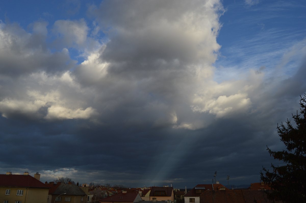 Je oblacno a vitr je uz jen mirny. Dopoledne a kolem poledniho byli caste slabe prehanky. Kolem 12:30 hod byli narazy hodne silne.