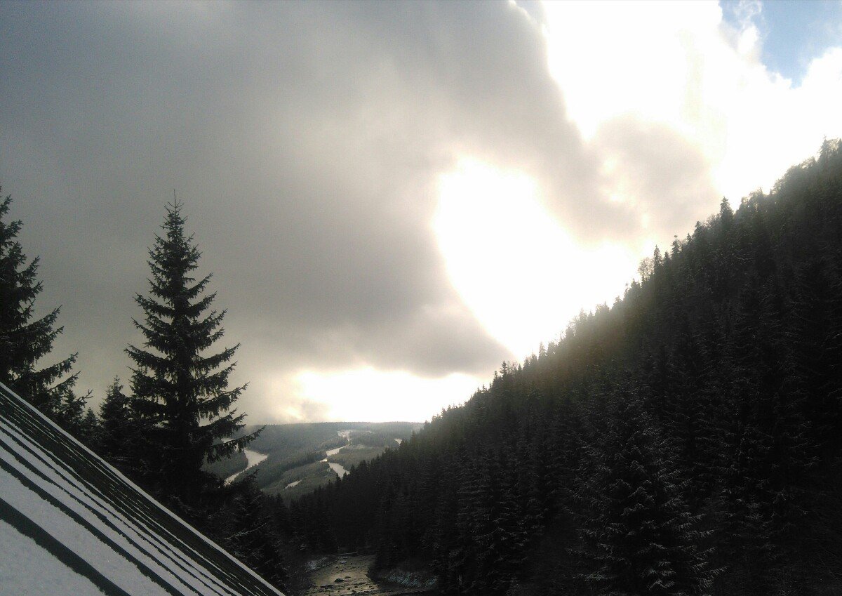 Je zatazeno a uz jen sem tam spadne vlocka. Jinak snezeni bylo docela silne ale na zemi se nedrzel. Vitr fouka slaby.