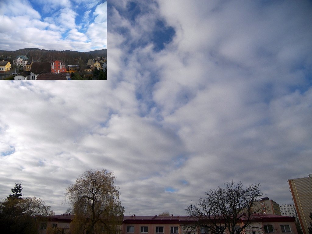 zataženo, sníh ve městě skoro všechen roztál, drží se jen nad městem tam je nesouvislí do 2cm