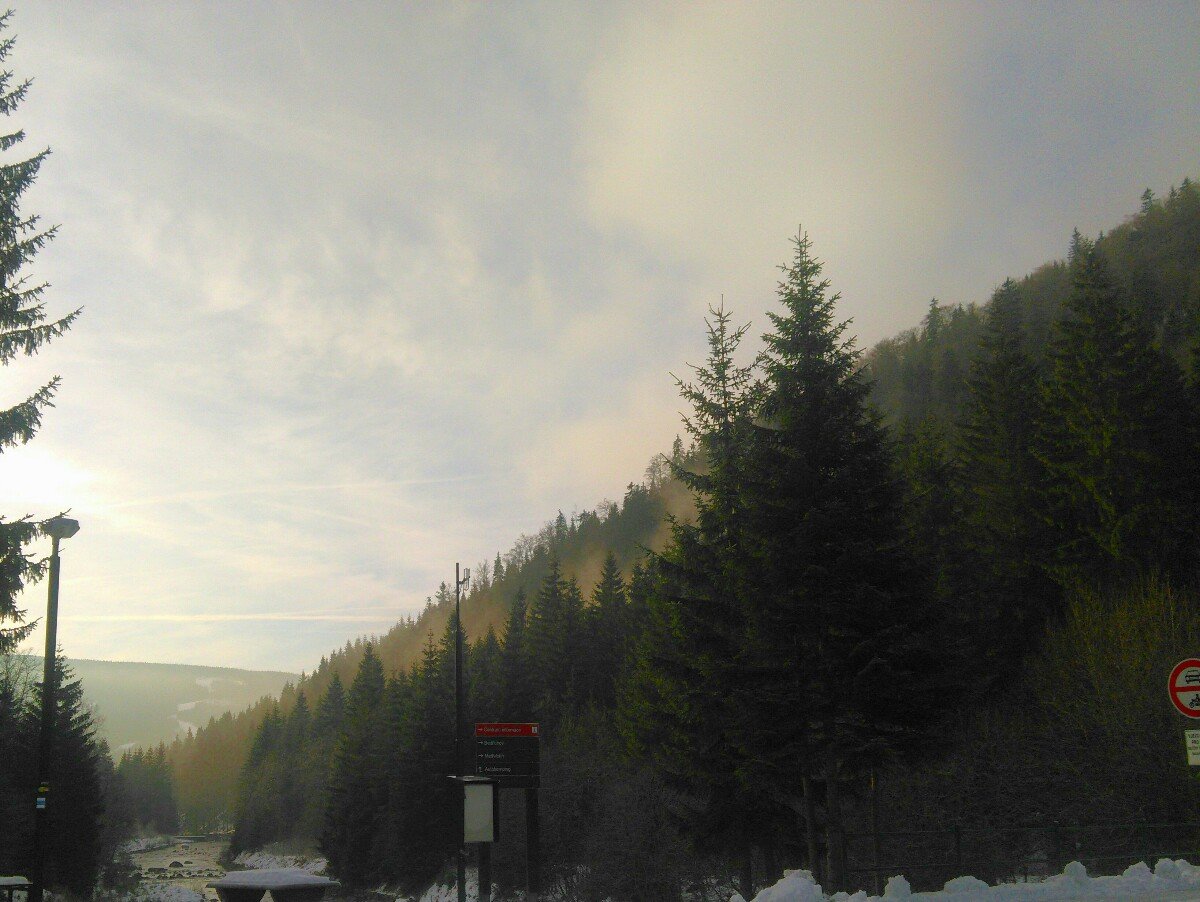 Ráno mlha a námraza, která nyní pomalu ustupuje pod sílou slunce.