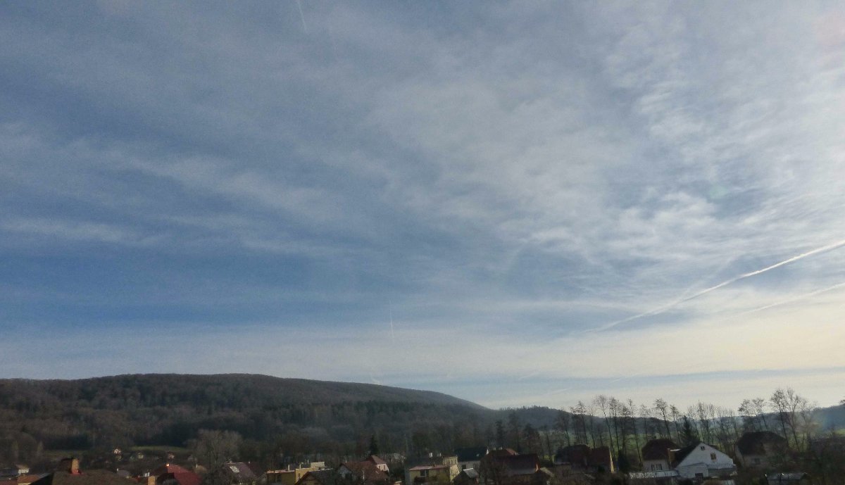 Oblačnost 17,7%, zákl.oblačnosti 1051,18m.n.m., tlak 1032,1hPa, dohlednost 30km, rel.vlhkost 81,2%, abs.vlhkost 4,96g/m3, mírný JJV vítr 156° 5,5m/s(4 Bft), poc.teplota -2,37°C, ochl.větrem -0,91°C, tepl.ros.bodu 0,46°C, tepl.mraků -6,94°C, ozon 324D.U.(+3%,normální stav).