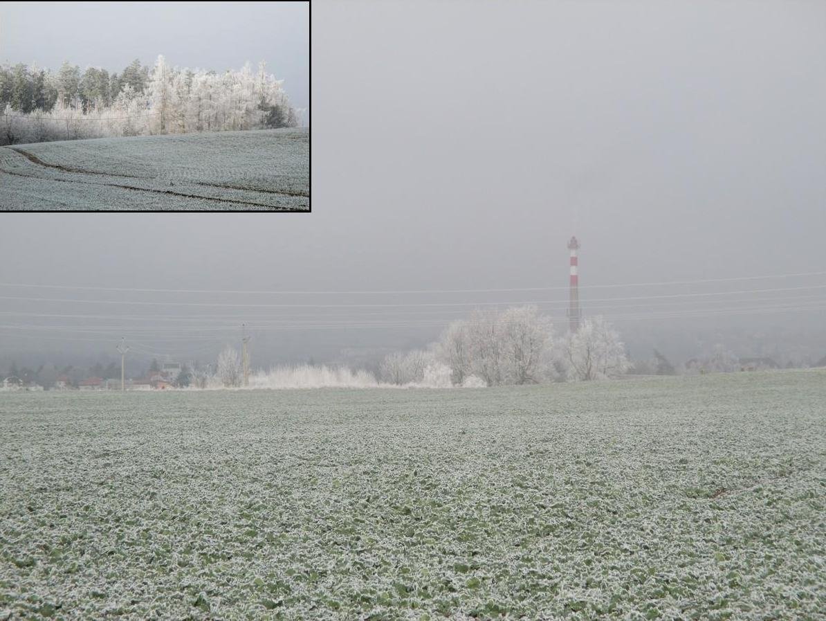 Rozpouštění nízké oblačnosti, tlak 1029,2 hPa, vlhkost 90 %, slabý JV vítr.