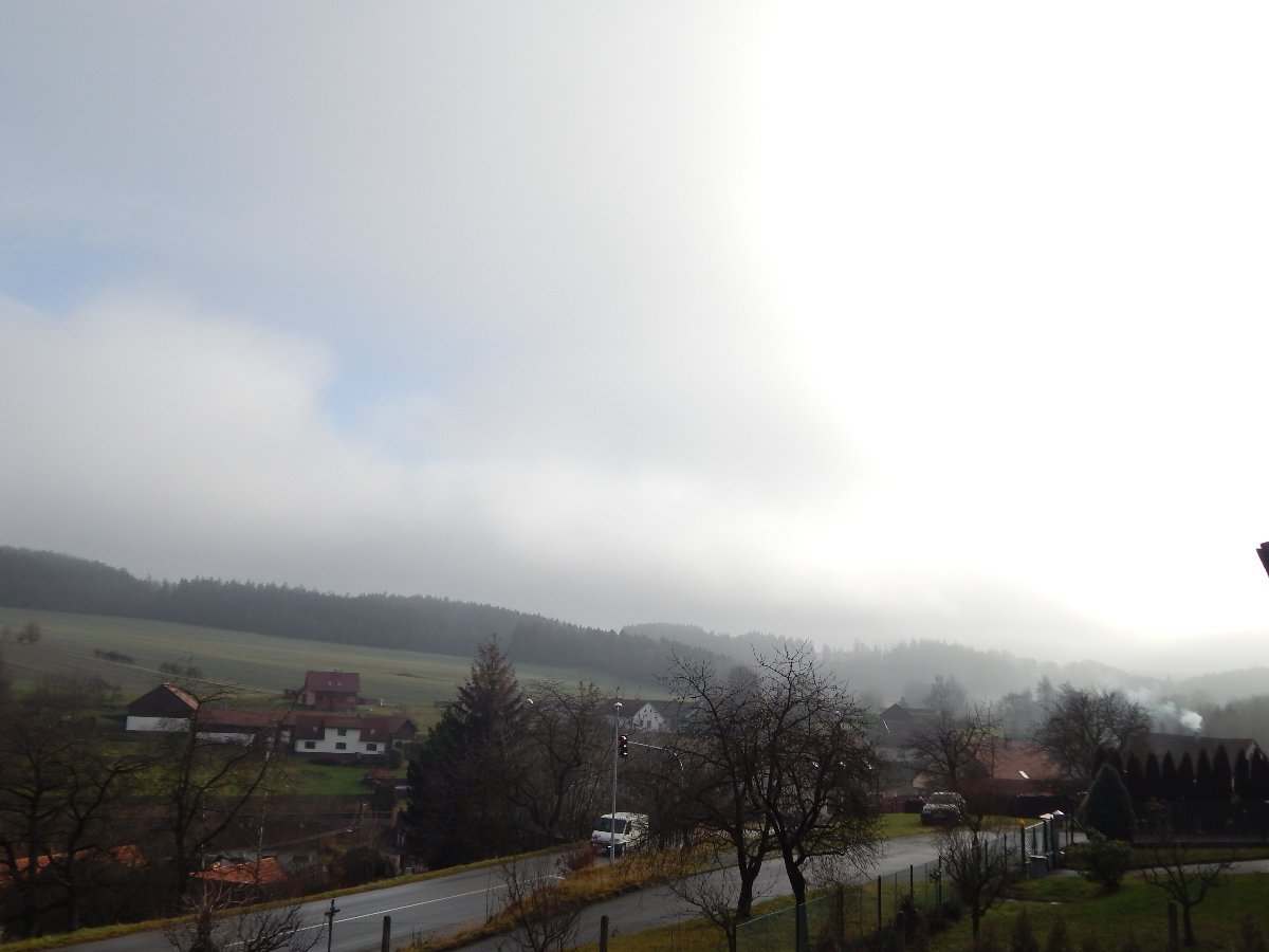 Mlha začíná opět houstnout, slabě mží, tlak 1025,7 hPa, slabý JV vítr nebo klidno.