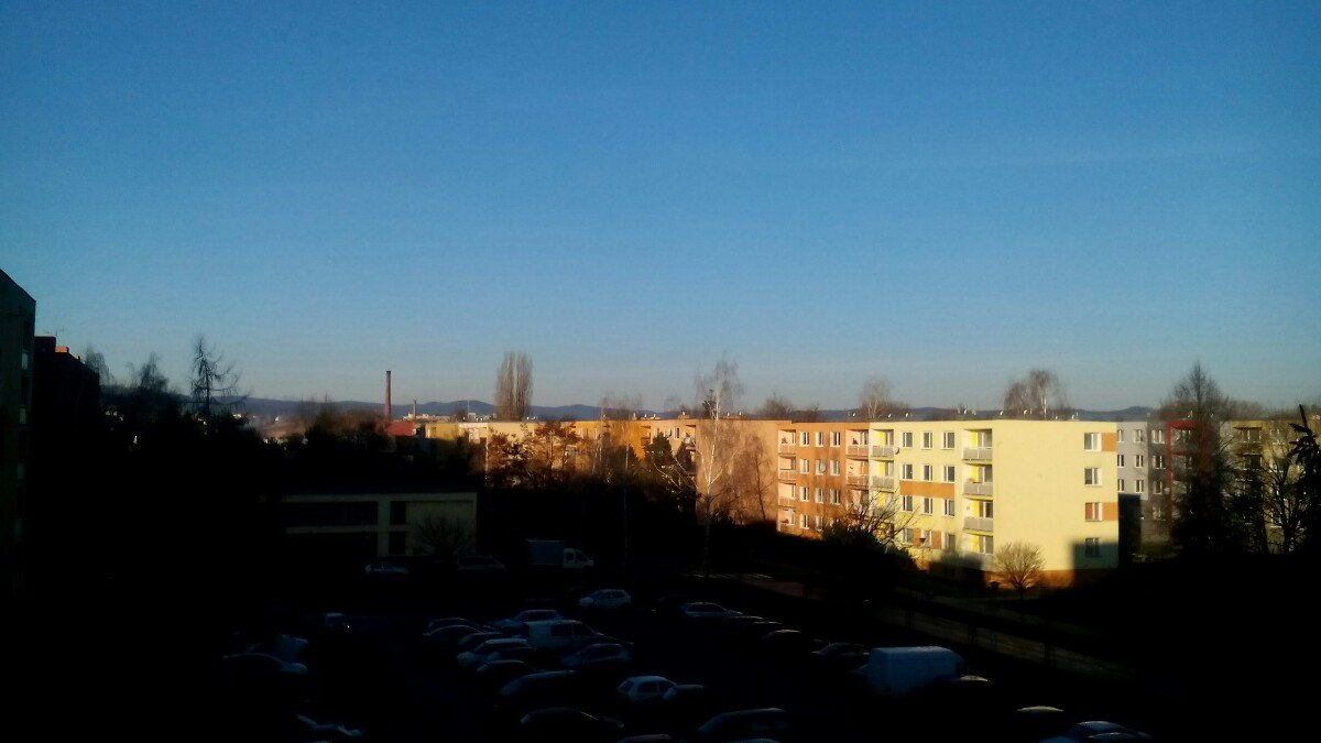 Dohlednost 500 m, ale přesto je vidět oblačnost. Bezvětří a tlak 1027,8 hPa.