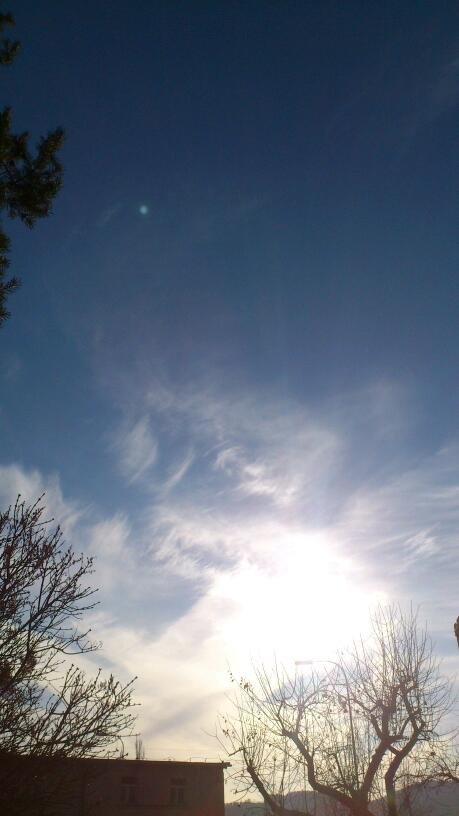 foto z 2015 12 31 v 10:24 zachycuje modrou oblohu sem tam se závěsem mráčků - zelené nezasněžené stromy - spíše Velikonoce