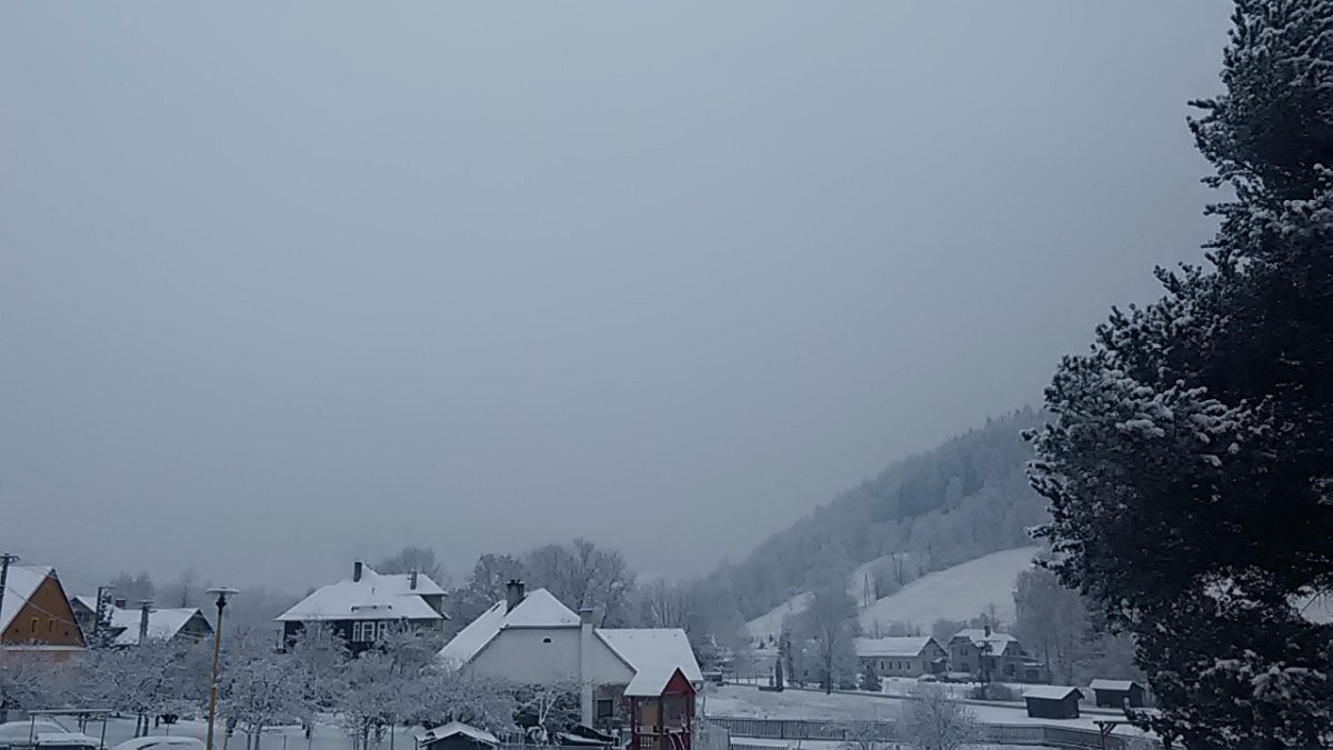drobně sněží chvilkami i trochu víc, už začíná byt bílo a je mlhavo