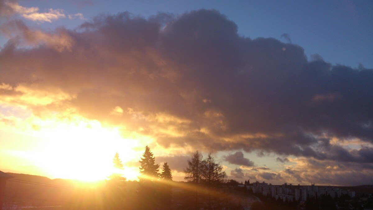 ...včera okolo 22té husté sněžení postupně přešlé do deště umylo na kopečkách sníh ze stromů od cca 700m nm, ranní přízemní mrazík trochu zpevnil břečku na chodnících a konečně svítání bez mlhy s rychlým střídáním oblačnosti... bezvětří..