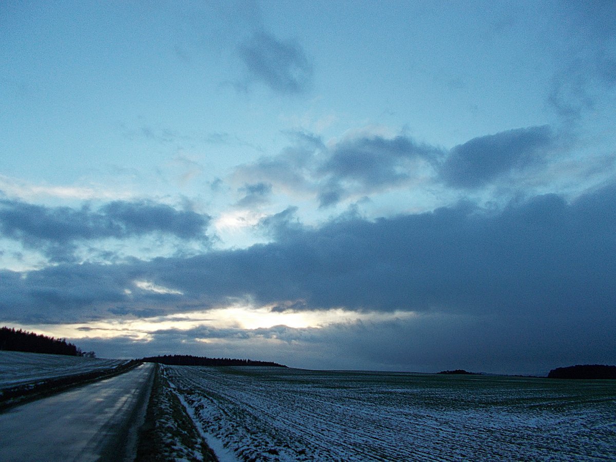 ...silnější západní větřík v nárazech, střídající se déšt s mrholením po celé odpo., rychlý postup oblačnosti s nečekaným vyjasňováním před soumrakem a po soumraku i pojukávání srpku měsíce na západní obloze skrz oblačnost - po osmé věčerní padající "trakaře" s deštěm - na zemi vše tající...