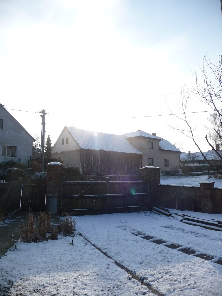 ...zasněžené větrné turbíny a výška sněhu na protější střeše... oblačnost 4/10...