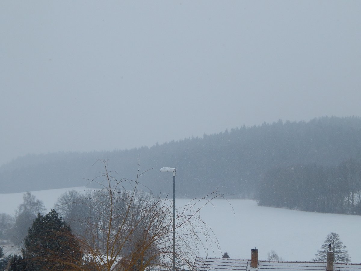Mírné až silné sněžení, tlak 1032,7 hPa, JZ vítr do 3 m/s.