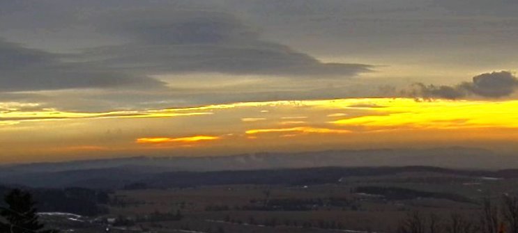 Oblačnost 50,2%, zákl.oblačnosti 421,64m.n.m., tlak 1026,1hPa, dohlednost 3km, rel.vlhkost 98,8%, abs.vlhkost 4,19g/m3, SSV větřík 25° 2,6m/s(2 Bft), poc.teplota -5,99°C, ochl.větrem -5,38°C, tepl.ros.bodu -2,07°C, tepl.mraků -6,04°C, délka dne u nás = 9hod.9min.51vt.