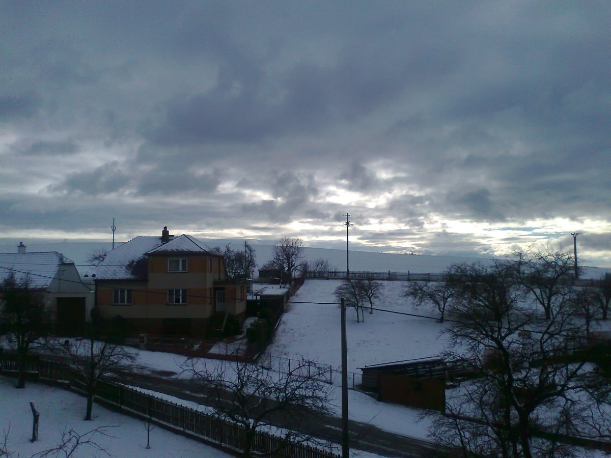 Ubývání oblačnosti od Z, tlak 1005,1 hPa, vlhkost 84 %, Z vítr 4-7 m/s. Ranní sněhový poprašek rychle roztál.