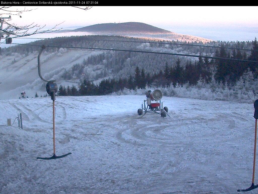 Setrvalý stav,zataženo nízkou inverzní oblačností,zhruba 15km od nás /bunkr Stachlberg/si žije svoje mikroklima,sněží z inverze.