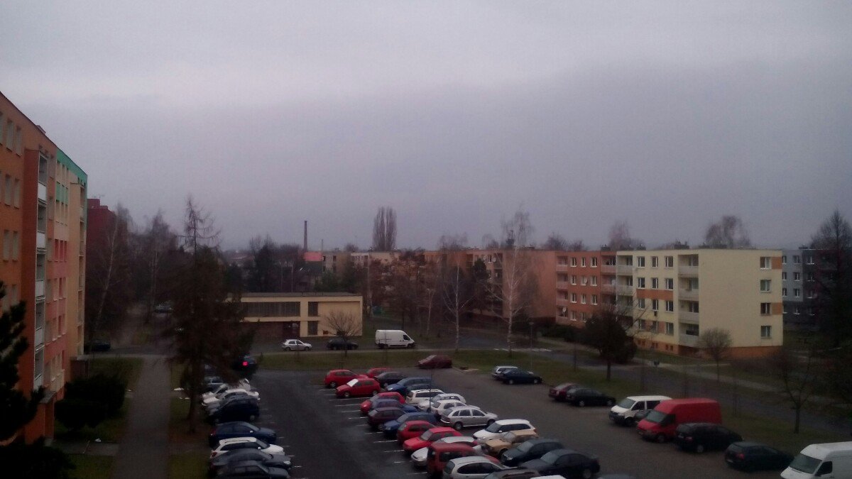 tlak 1002 hPa, vlhkost 98%, stále sněží