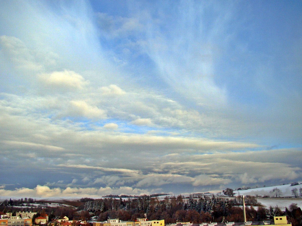 ...oblačnost již jen po obzoru, nad hlavou jasno, bezvětří a barevný západ slunce...