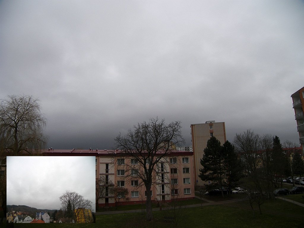 Oblačnost 83,6%, zákl.oblačnosti 846,64m.n.m., tlak 1028,5hPa→, dohlednost 30km, rel.vlhkost 86,7%, abs.vlhkost 5,74g/m3, čerstvý SV vítr 46° 8,4m/s(5 Bft), poc.teplota -2,78°C, ochl.větrem 0,47°C, tepl.ros.bodu 2,56°C, tepl.mraků -3,73°C, délka dne u nás = 11hod.46min.29vt.