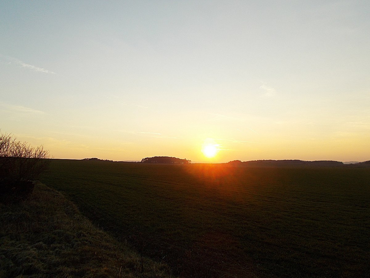 ...zapadající velké sluníčko, obloha pouze s řasovitou oblačností a kondezem z letadel, téměř bezvětří...