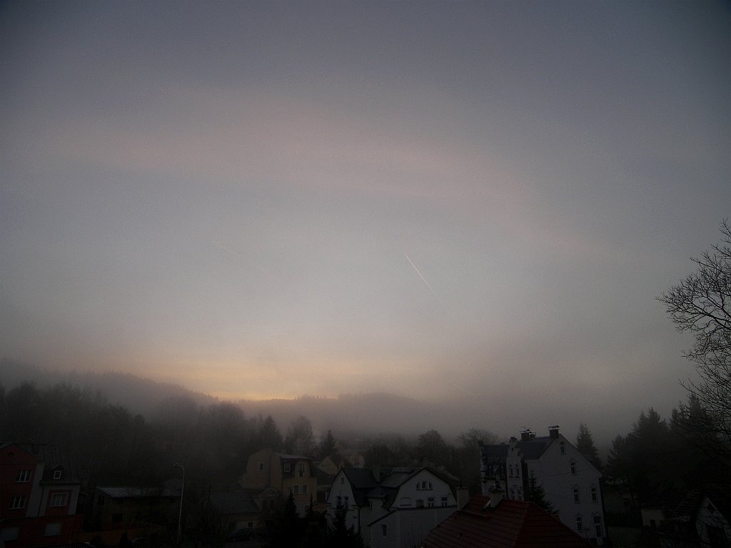 ... obloha plná zářících hvězdiček, smějící se měsíček a při zemi přízemní mrazíček... jasno, bezvětří - hodně slabý severní vánek odnáší invezní čmoud k "chodovce"...