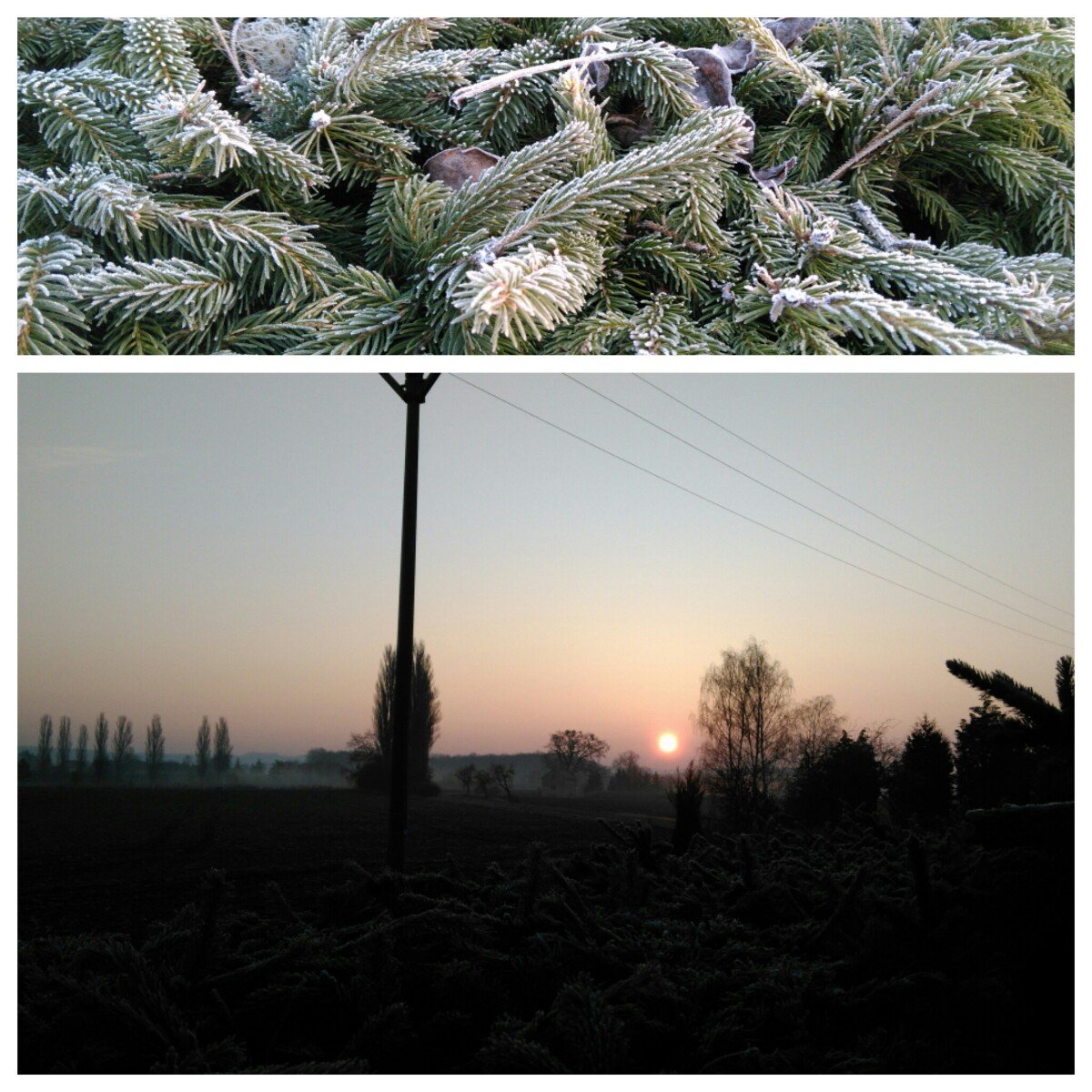...růžový ůsvit, padající mlha, bezvětří, namrzlá auta a střechy domů, na obloze letadlí čmáranky a řasovitá oblačnost...