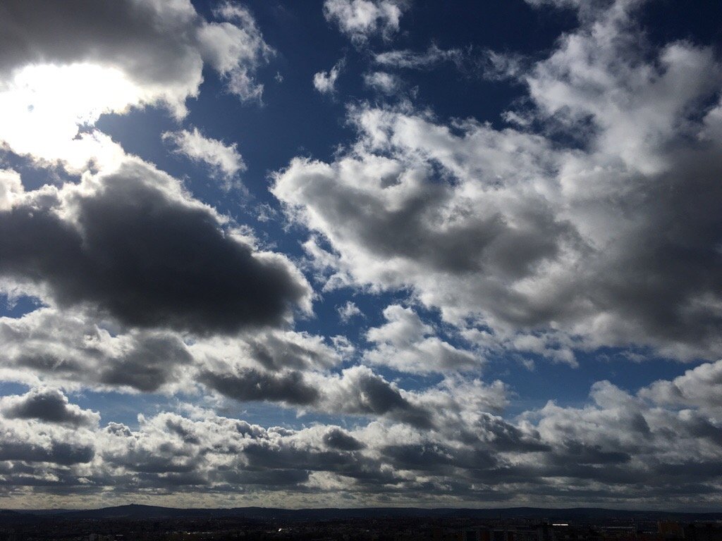 V noci pršelo, dopoledne vítr žene různě nacucané mraky. Občas je vidět modrá obloha, prší nebo jako nyní padají kroupy.