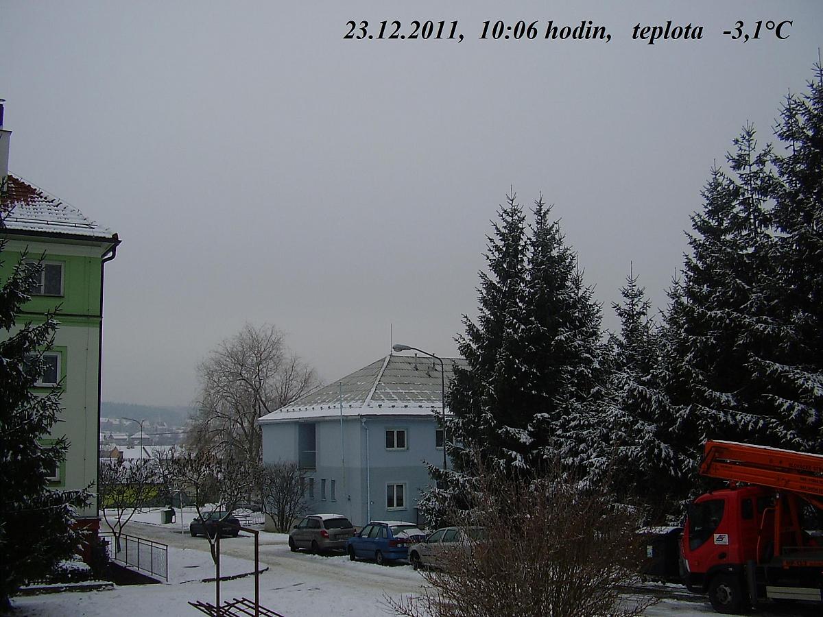 zataženo, kouřmo, od rána občasné mrholení, ve druhé polovině noci déšť 0,8 mm, minimum od půlnoci 0,1 °C, sněhu už jsou jen zbytky především v lesích a na stinných místech foto ze včera před setměním