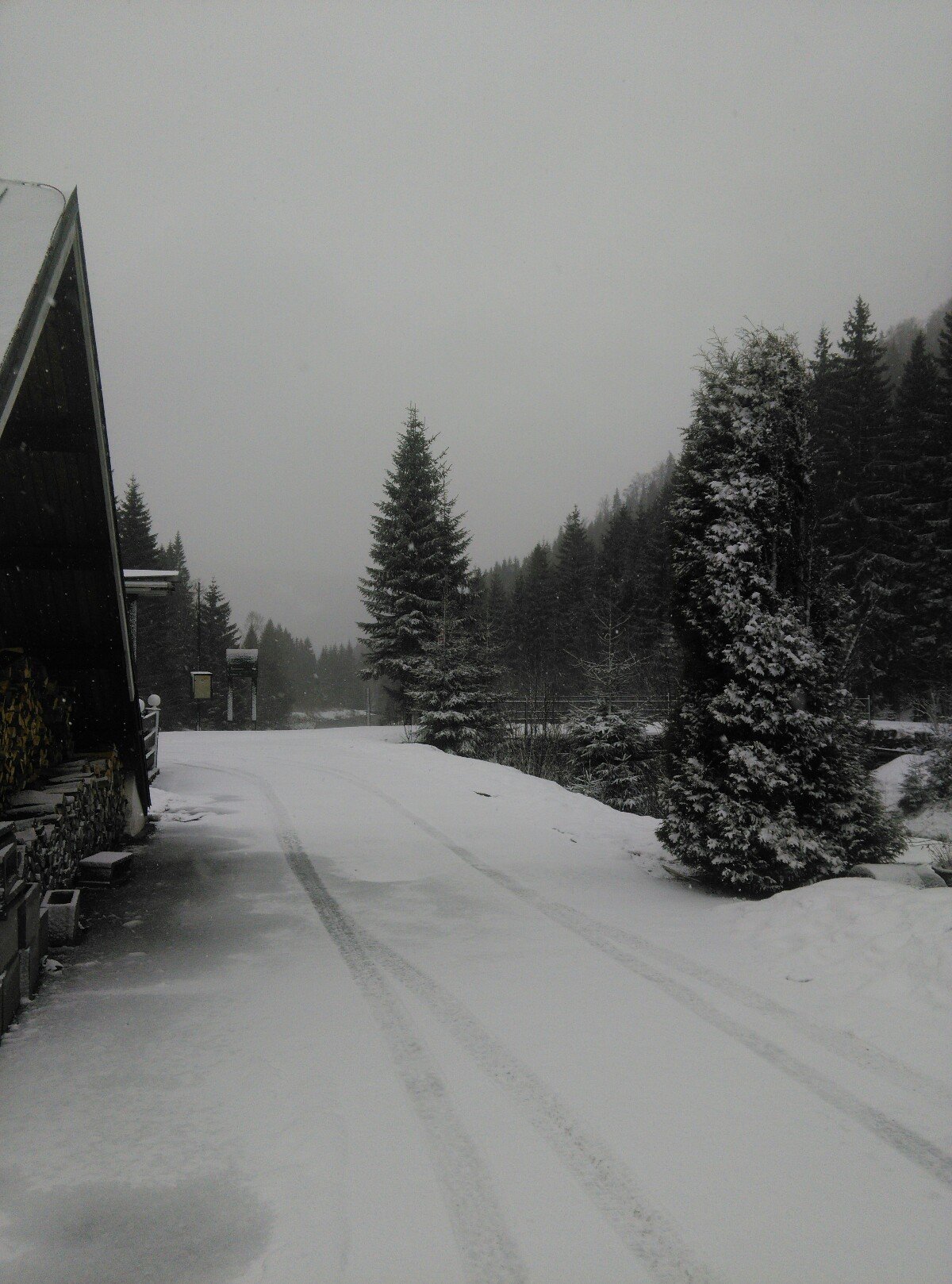 Na zemi leží 1-3cm sněhu, podle toho, jak zrovna intenzivně sněží. Čerstvý vítr.