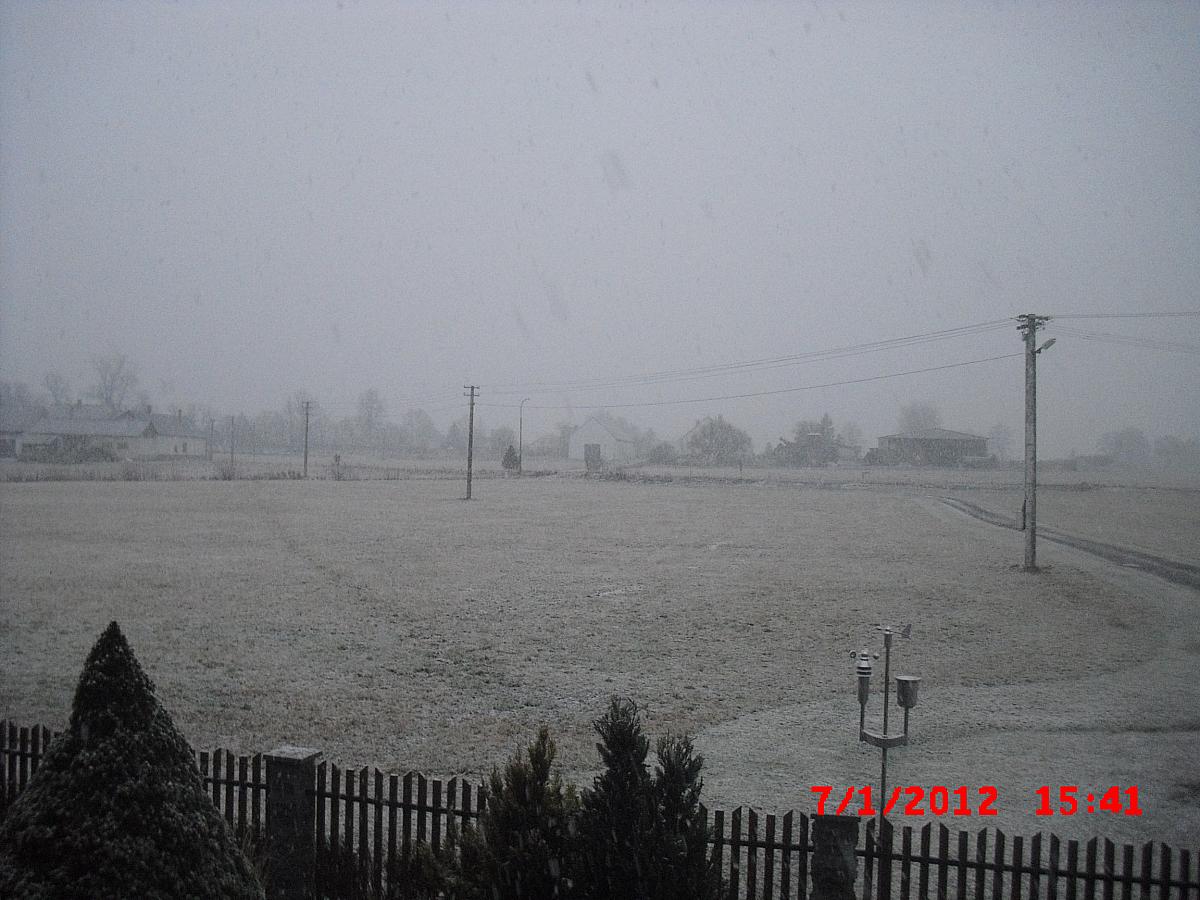 Ještě jedna fotečka severozápadní směr.Teplota stále ač pomalu tak klesá.Sněžení už není tak hustý ale sněží tak akorát chvíli víc chvíli mín.Podle radaru by mohlo ještě tak hodinku sněžit.