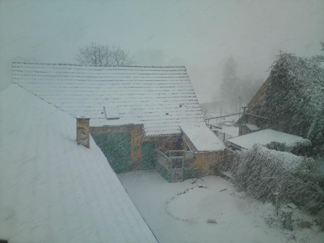 kolem deváté hodiny silná sněhová přeháňka napadl poprašek, který zanedlouho roztál, o hodinu později podobná silná přeháňka po čtvrt hodince zeslábla padali sněhová zrna dohlednost byla na sever 0,5 km tam stále silně sněžilo ale na jihu byla vidět 50 km vzdálená Kleť :) ale zanedlouho se přihnala sněhová bouřka s jedním výbojem ve vzdálenosti do 1 kilometru dohlednost klesala na 20 metrů a byl nízko zvířený sníh takže nefalšovaná bílá tma za kterou se nemusí stydět ani na hřebenech hor, při normálním sněžení tu je dohlednost 50-100 m, sněhu už bude kolem 5 cm a stále silně sněží v kombinaci se silným větrem, poprvé jsem si zažil bílou tmu na vlastní kůži toto tu nepamatuju! :), na fotce přeháňka před bouřkou
