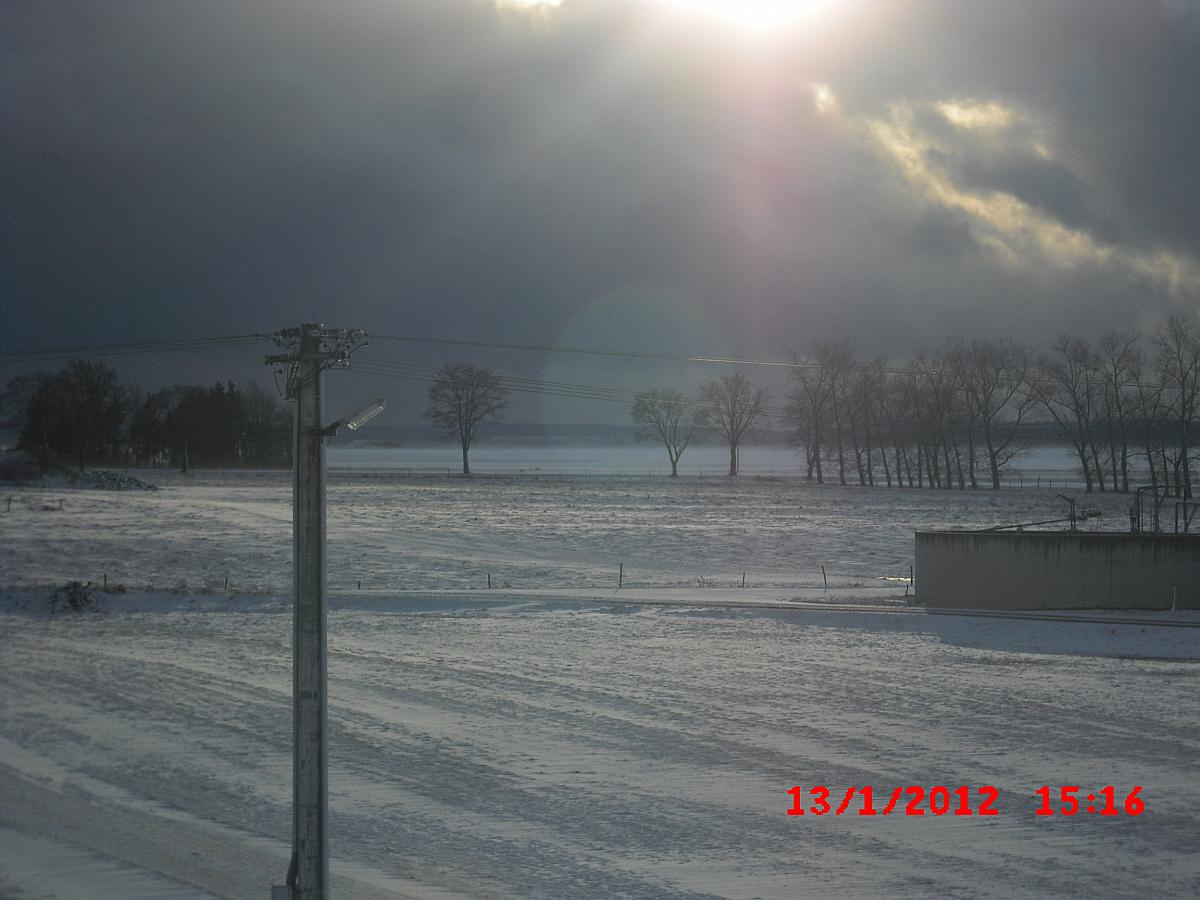 Ted se projasnilo a je polojasno.Přidávám fotku po dnešním sněžení ze zahrady.Napadlo cca7cm nedá se to přesně určit vzhledem k větru.Takže někde je mín někde i víc ale v průměru je tak těch 7cm.Vítr fouká okolo 8m/s a tvoří se sněhové jazyky.Na polích a větších pláních je sníh chvílemi i vysoko zvířený.