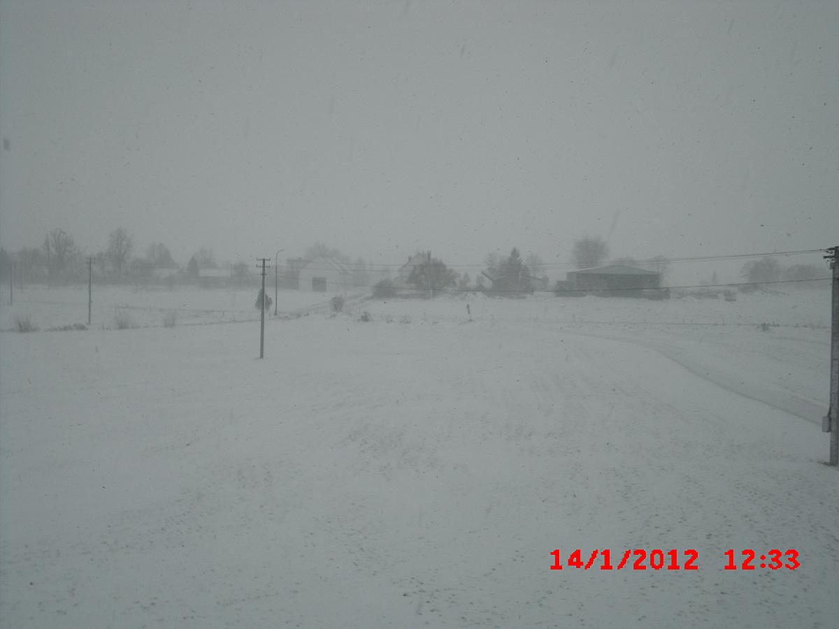 sněžení slabé trvalé, přes noc napadly další 2 cm sněhu, celkem je ho v průměru 7 cm ale na polích je jen pár cm jelikož je sníh vyfoukaný, nízko nebo vysoko zvířený sníh vítr 6 m/s Z, na fotce nízko zvířený sníh přes cestu