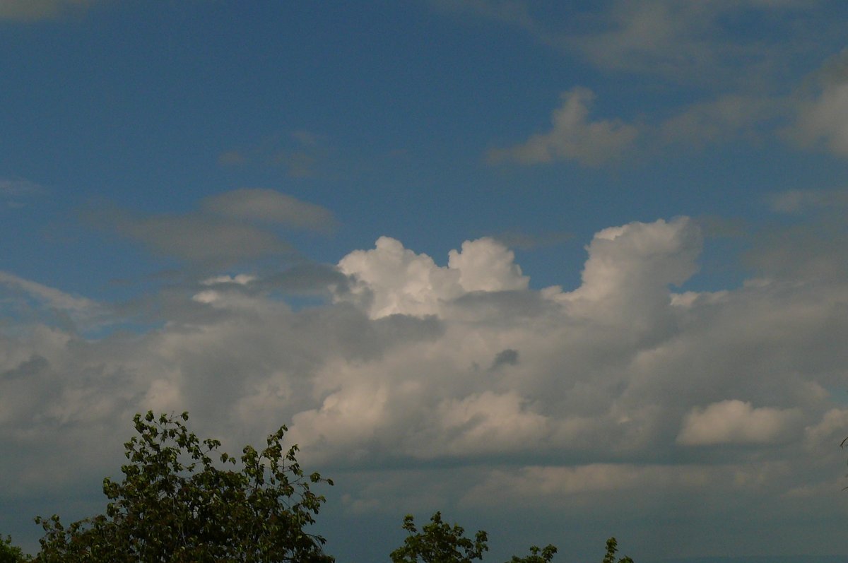 Pohled na oblohu na JV, od západu protrhávání na polojasno. Od rána spadlo sotva pár kapek. Vítr.