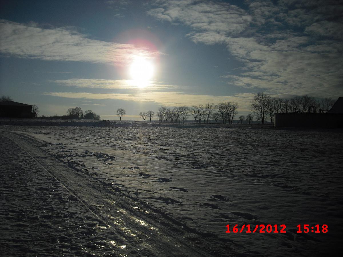 Je skoro zataženo,zatím ještě bez sněžení ale od severu už se pomalu srážky nasouvají.Fotka dnešního rudého západu slunce.