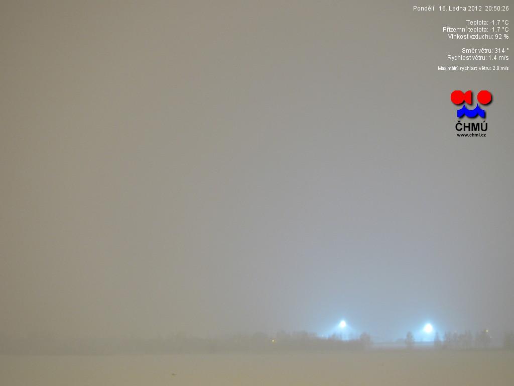 Zataženo, sněží, vlhkost 91,2%, viditelnost 1,5km, vítr ZJZ 4km/hod., tlak 1022,5 hPa, zákl.mraků 123m.