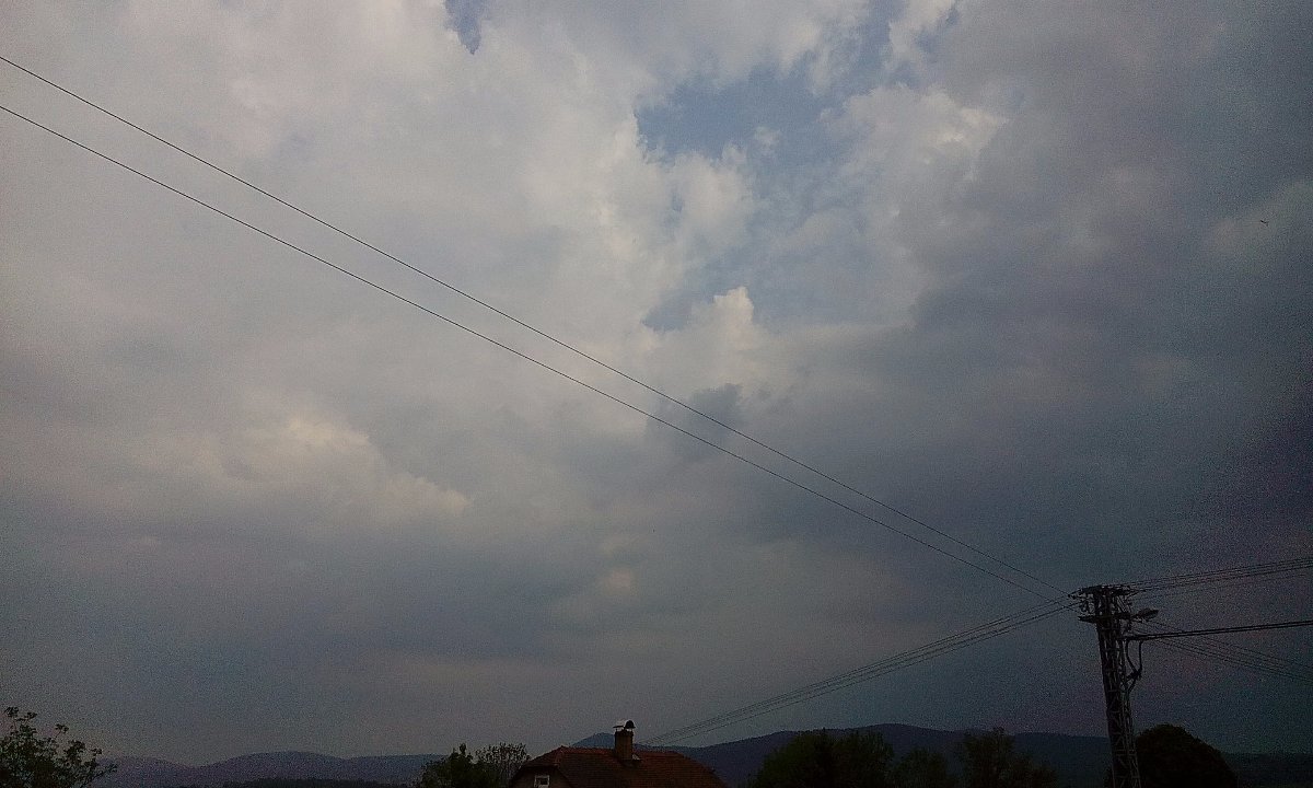 ... dopoledne ještě zkopírované počasí minulých dní, od jedné odpo přibývání oblačnosti, okolo půl čtrvté ukončily včely letový provoz a ve čtyři nás obešla s hřměním celkem neškodně bouřka (20 min deště), nyní za silných nárazů SZ větru se na nás podívalo sluníčko z hodně oblačné 8-9/10 oblohy...
