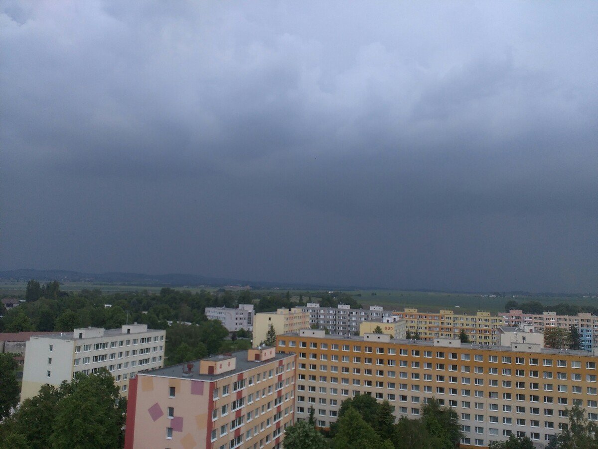 Dusno,slabý vítr,tlak 1011 hPa,na sever od nás přechází bouřka.