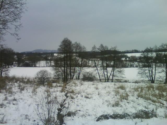 Větší část dne zataženo, jen za poledne trochu protrháno - neprší, ale je nepříjemný vítr - fotka vyfocena dnes v 16:10, když jsem šla z knihovny - jen tam někde v dáli je vidět sníh, co včera napadlo v noci déšť rozpustil